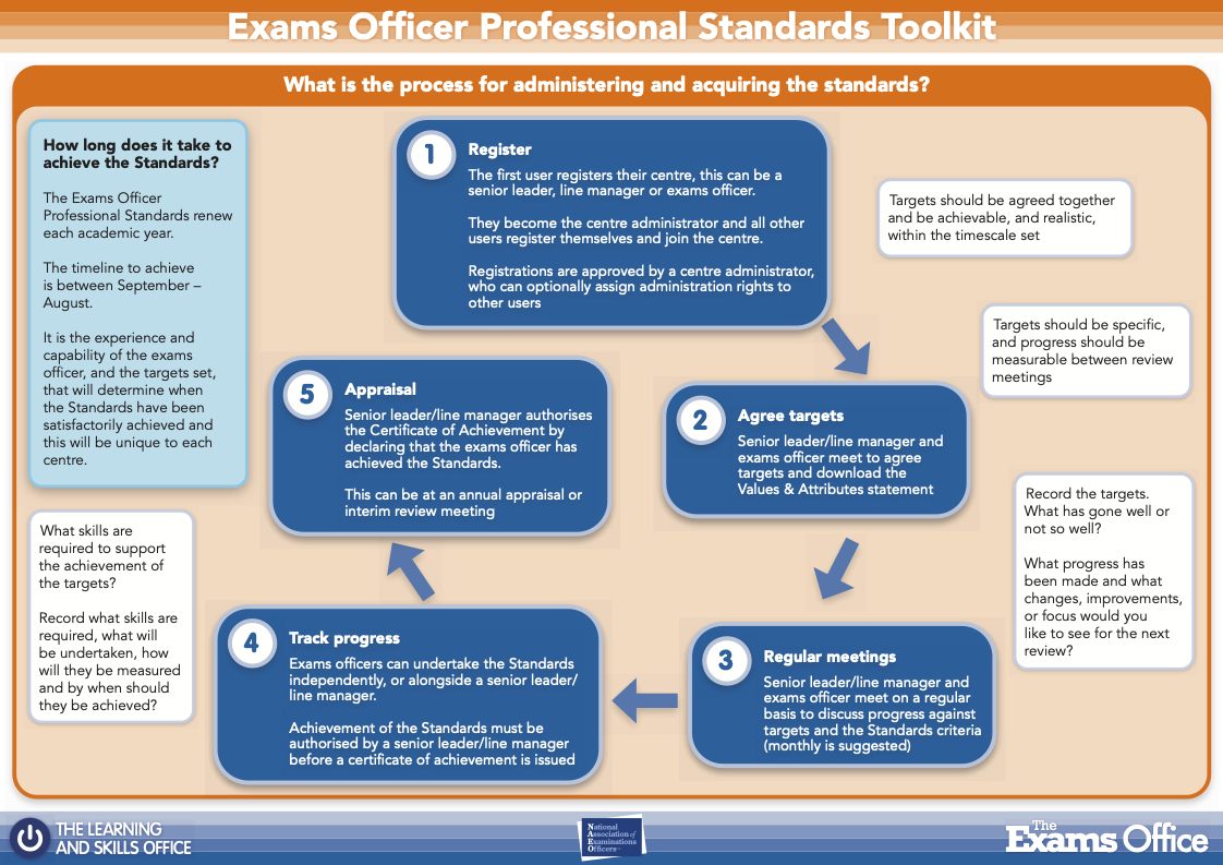 The Standards serve as a framework for an exams officer's CPD by ensuring that their targets focus upon key areas such as Knowledge and Understanding, Key Skills, and Values and Attributes, and that progress against targets is closely monitored and recognised.
